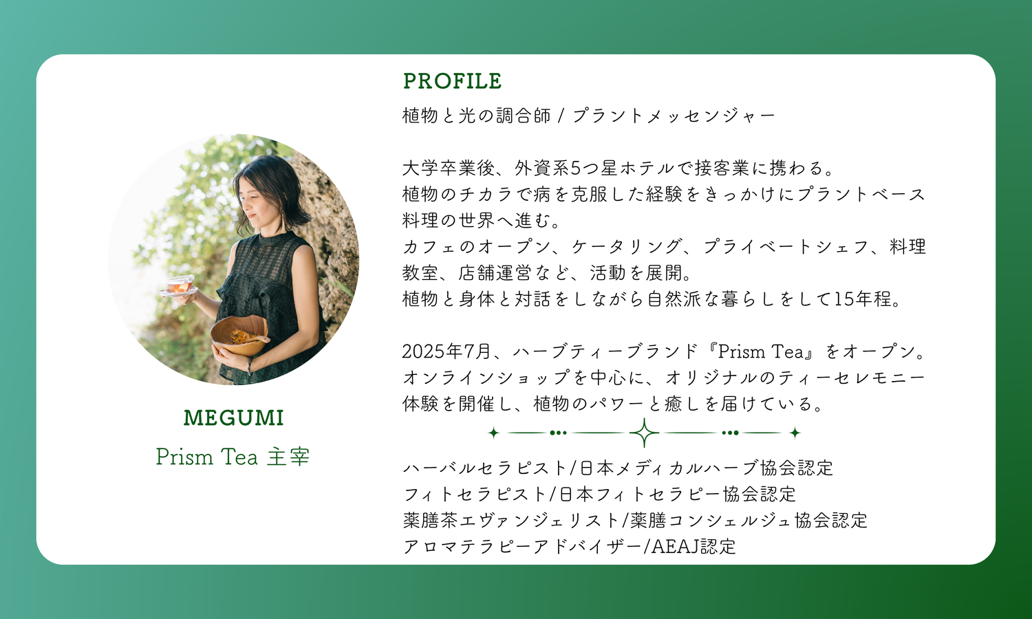 植物に触れ、感じ、自分とつながるひととき。自分のからだとこころの声に耳をすませ「今日の私」にぴったりなハーブを選ぶ。まるでジュエリーボックスを開いてアクセサリーを選ぶように。Prism Teaはそんな、自分を内側から大切に整える時間を届けたいと思っています。 -