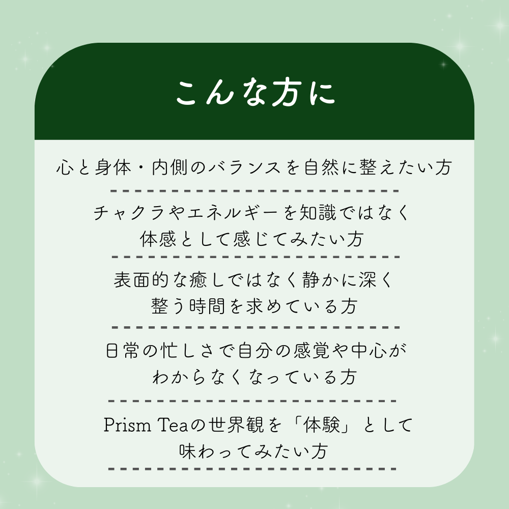 ◯特定のハーブ、植物にアレルギーをお持ちの方(*Prism Teaにはオレンジを使用しているものがあります。またその他使用ハーブについて確認されたい方はお気軽にご相談ください)